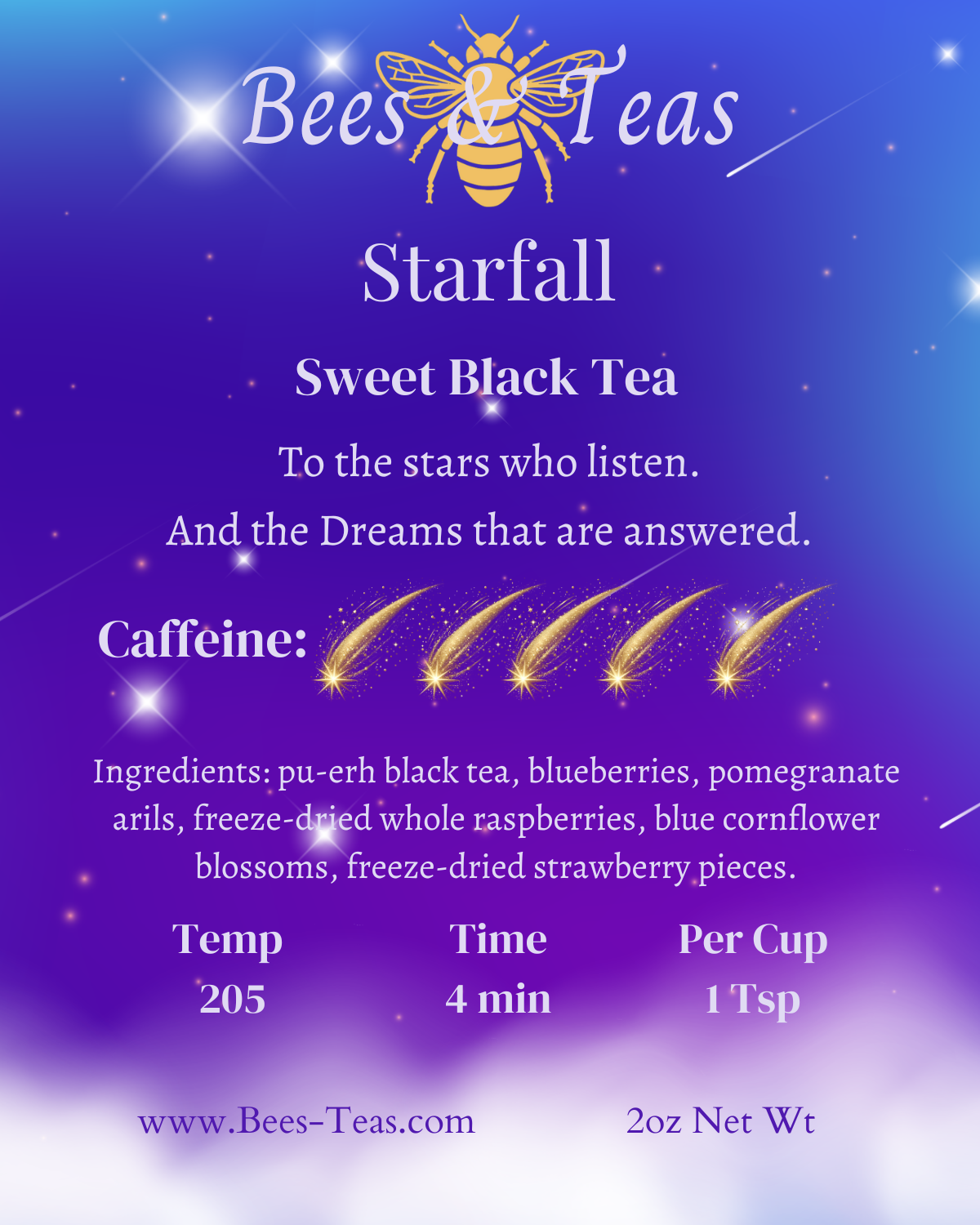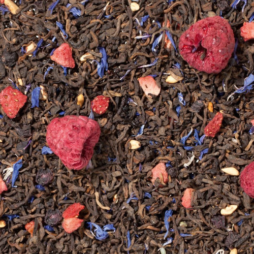 Ingredients: pu-erh black tea, blueberries, pomegranate arils, freeze-dried whole raspberries, blue cornflower blossoms, freeze-dried strawberry pieces.