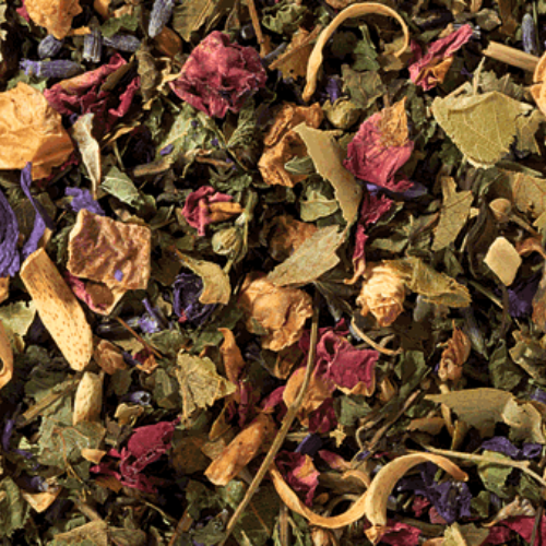 Ingredients: silver linden blossoms, Melissa leaves, lavender, rose petals, sweet blackberry leaves, marigold blossoms, apple pieces and mallow blossoms.