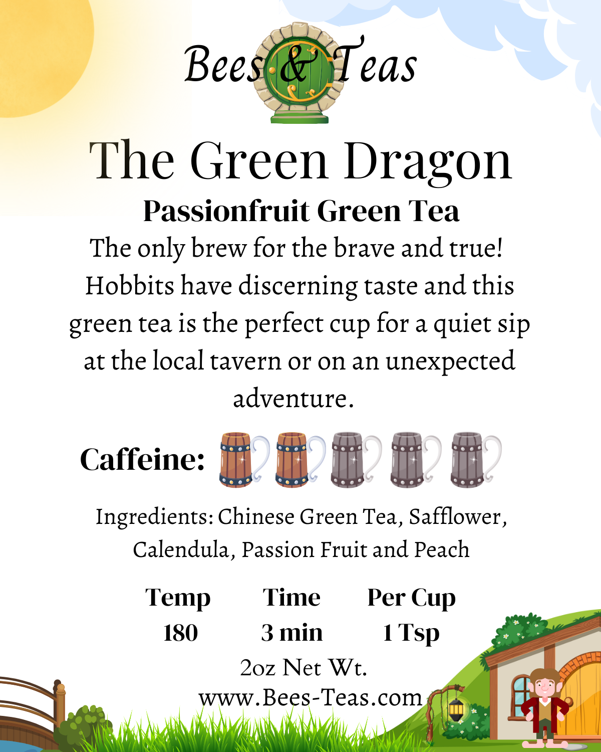 The best brew in the Shire the Green Dragon will have you celebrating with friends. Only for the brave and true this blend of Mao Feng green tea, safflowers, marigolds. peach and passion fruit will not disappoint.