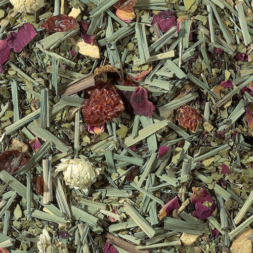 Ingredients: green yerba mate tea, lemongrass, rose hip peel, ginger pieces, black pepper, cardamom (whole), basil, rose petals, Roman chamomile.