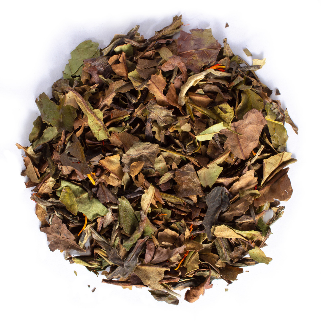 Ingredients: white tea, marigolds, peach pieces and natural peach flavoring.
