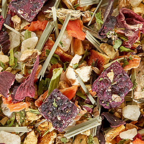 Ingredients: ginger cubes, ginger pieces , lilac, dragonfruit cubes, hibiscus blossoms, carrot flakes, orange peel, lemon grass, flavoring, ginger slices, coriander.