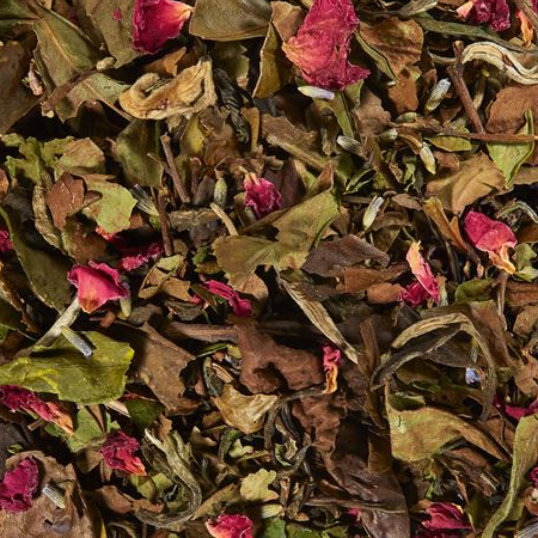 Ingredients: white tea (56%), green tea (26%), lavender, peppermint, sweet blackberry leaves, rose petals, flavoring